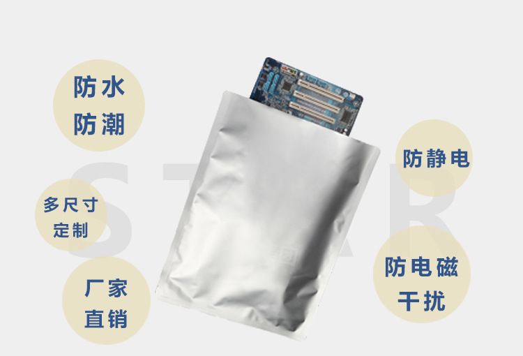 产品性能:俗称防潮袋、真空袋、铝塑复合袋、真空袋、大型立体防潮袋),其材质一般为BOPP、PET/AL/CPE 三层复合或BOPP、PET/NY/AL/CPE四层复合.其中PET—印刷效果好,NY—透氧性低,AL—阻隔性强、不透光,CPE—包装内层、具有热封性。其具有良好隔水, 阻气防潮功能, 防静电功能优秀,静电场缓慢安全的泄放, 防潮铝箔袋材质手感舒适、顺滑,刚强、柔韧兼备可制作平口袋、信封袋、立体袋、风琴袋等多种袋式.可印刷产品说明,公司徽标等等,提升产品形象.防潮铝箔袋适用于IT电子通讯行业,五金,PCB板,竹板,网卡,显卡,显示器,数码电子等等产品的包装。